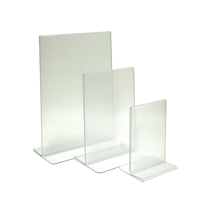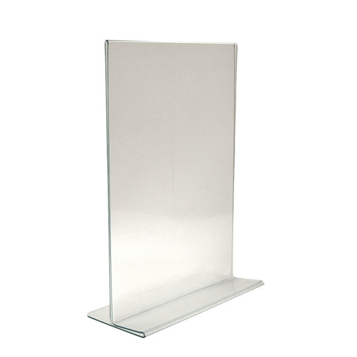 Akryyliteline T-malli on kestävästä ja kirkkaasta muovista valmistettu infoteline, jonka erikokoiset versiot soveltuvat pöydille, tiskeille ja standeille.