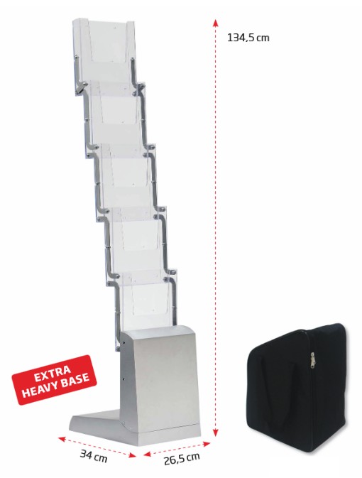 Esiteteline lokeroilla on kokoontaittuva tyylikäs, kestävä ja vakaa esiteteline messuille. Extra painava jalusta tekee telineestä turvallisen käyttää.