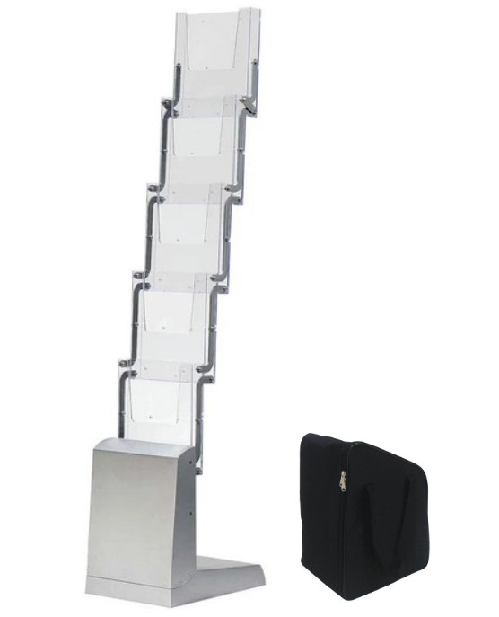 Enää esitteitä ei tarvitse kuljettaa erikseen, vaan ne kulkevat kätevästi mukana infotelineen lokeroissa. Esiteteline sisältää pehmustetun helposti mukana kannettavan suojalaukun.