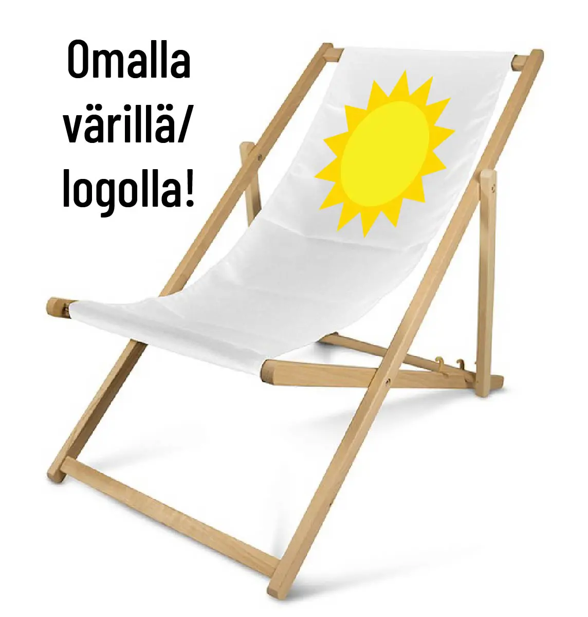 Beach kansituoli, aurinkotuoli, lepolasse tai rantatuoli, kuinka vain, rakkaalla kalusteella on monta nimeä. Ikoninen lepotuoli on ihanteellinen promootioihin, tapahtumiin ja terasseille. Saat sen täysin oman värisellä kankaalla ja logo painatuksella, jolloin näkyvyys on todella taattu ja se lisää brändisi tunnettuutta. Runko täyspuuta ja istuin kangas polyesteriä.