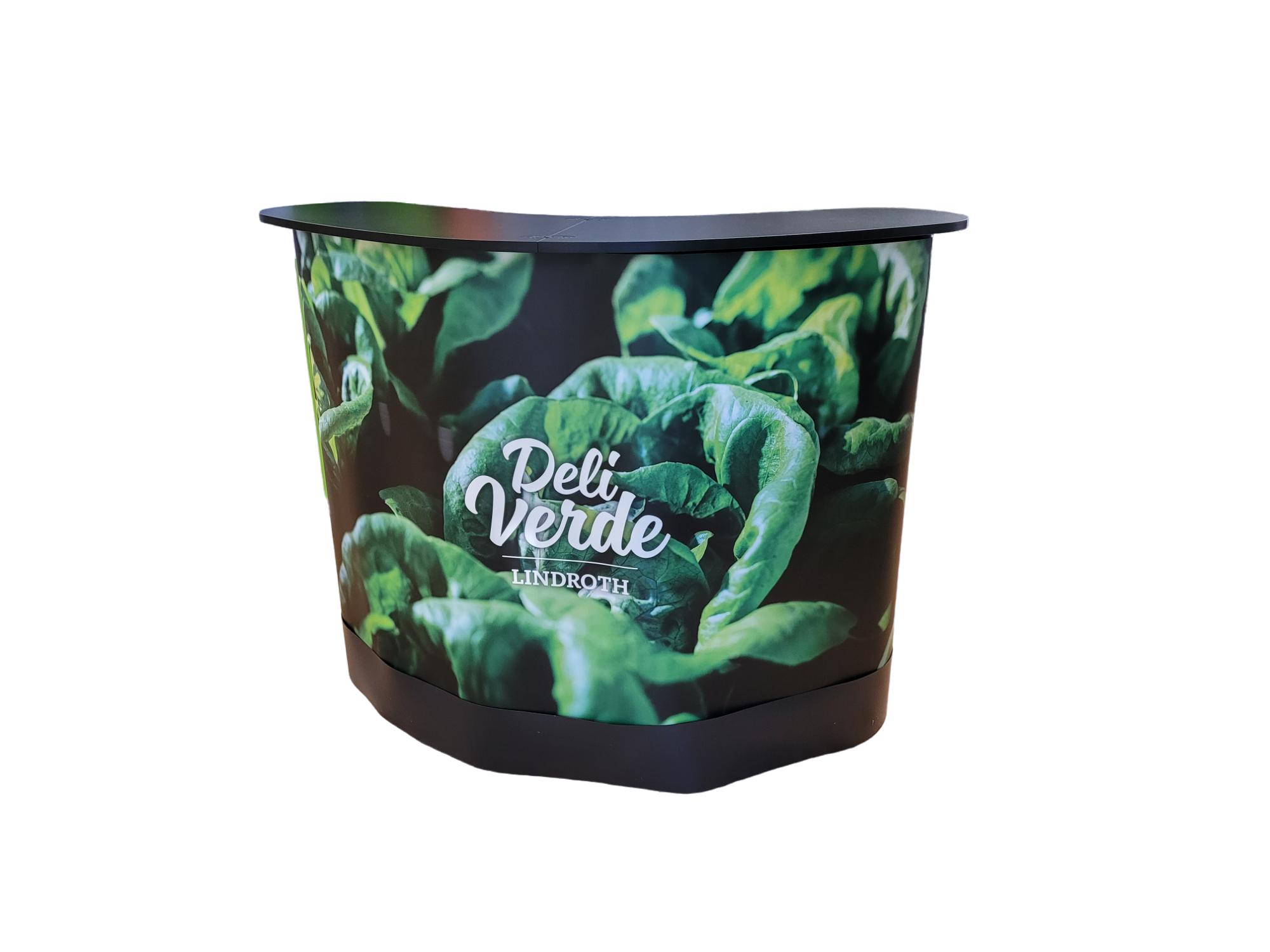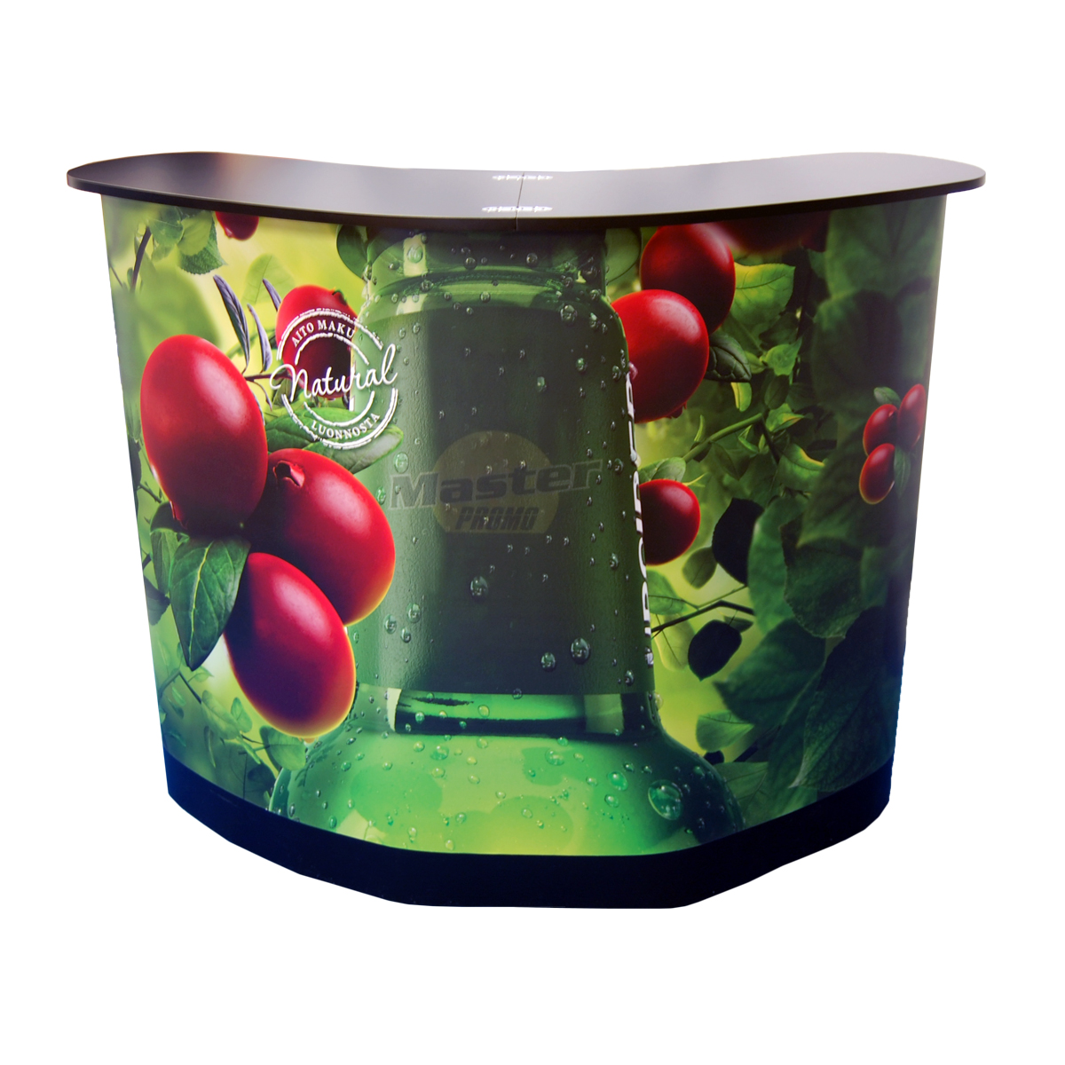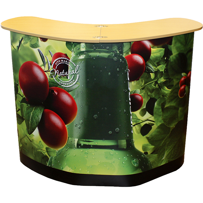 Messupöytä käytössä tyylikäs kuvavuota personoi koko pöydän etuosan ja kuljetuslaukku kätkeytyy pöydän rungoksi tapahtuman ajaksi. Kuvavuodan reunat ovat suojattuna koko pituudeltaan alumiinisen listan alla.